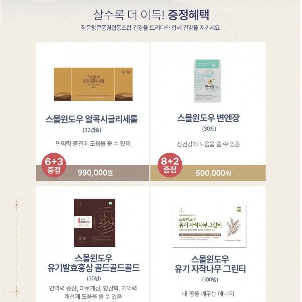 건강을 드리다 라는 슬로건을 가지고 건강기능식품, 건강식품, 생활용품, 주방용품 등의 제품군을 취급하고 있으며 모두 정직한 생산을 통해 만들어진 안전한 제품들만 제공하고 있습니다.